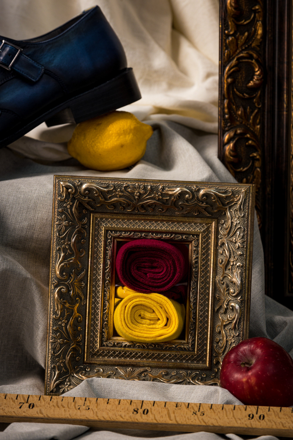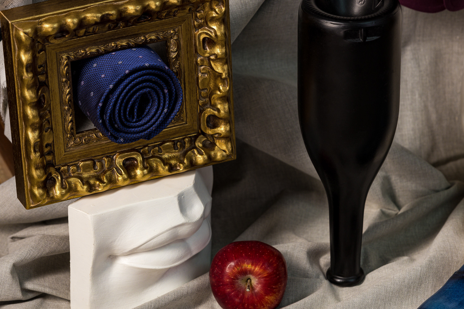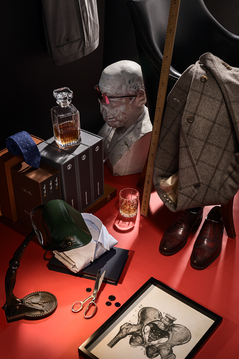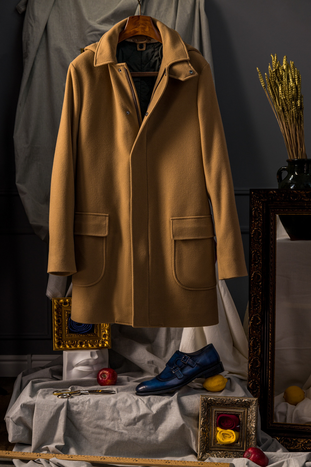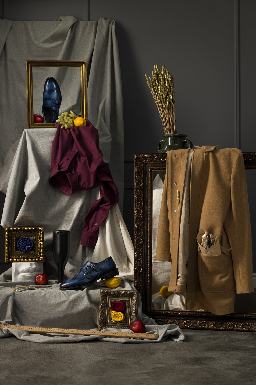 1. An Outfit as a Work of Art. Suit details framed by an artistic still life and picture frame.